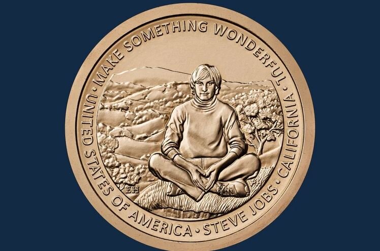 ارتباط فردا: ضرابخانه آمریکا اعلام کرد که این سکه، جابز جوان را نشان میدهد که چهارزانو در مقابل منظرهای از تپههای کالیفرنیا نشسته است و عبارتی با مضمون «چیزی شگفتانگیز بسازید» در بالای تصویر قرار دارد. این نقل قول سال ۲۰۰۷ برای ترسیم جهانبینی و میراث جابز توسط وراث او استفاده شده است.